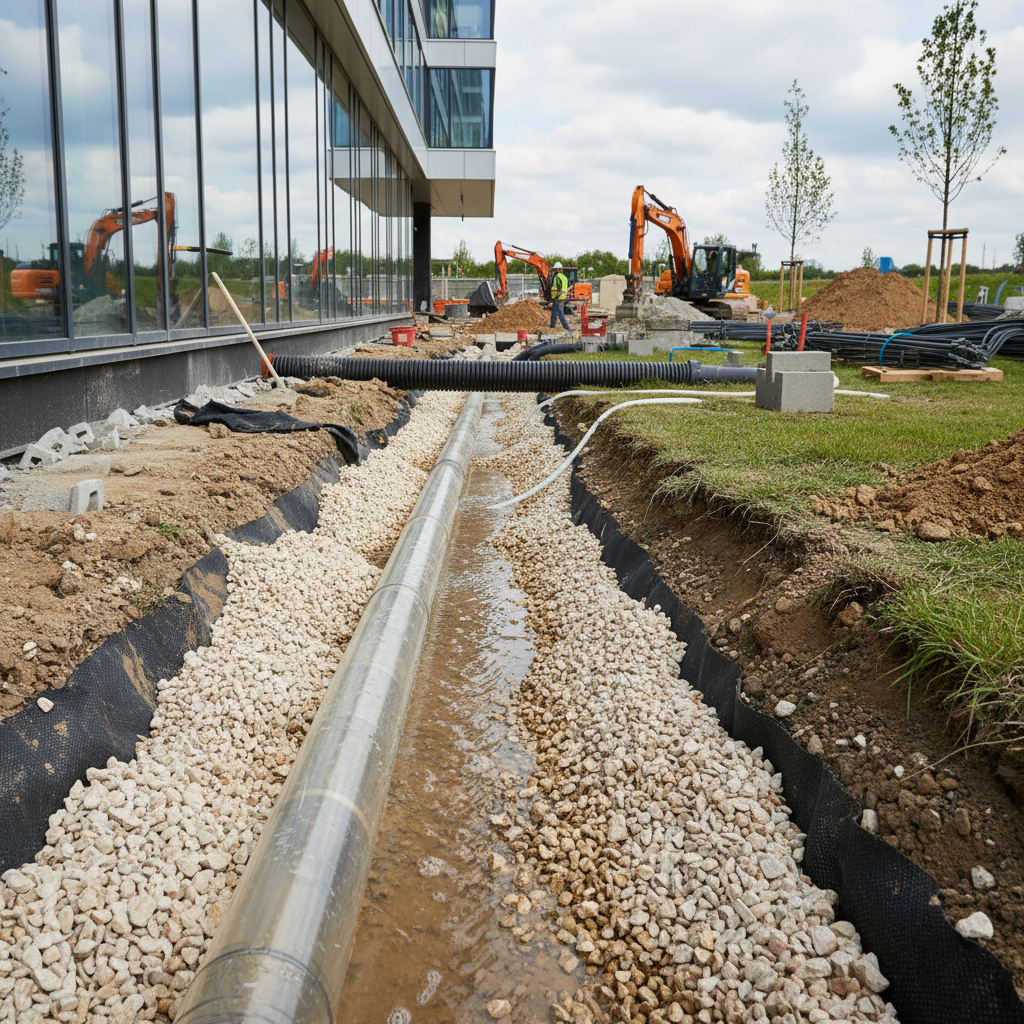 SP Construction, we specialize in designing effective drainage systems including French drains and stormwater management solutions. A French drain is a trench filled with gravel and a perforated pipe that reroutes surface and groundwater away from foundation or problem areas to prevent flooding and water damage. Our drainage design process begins with assessing your property’s water flow and problem points to place drains strategically. We ensure proper slope and positioning to direct water naturally to safe discharge locations such as sewers or retention areas. Components used include gravel beds to allow seepage, filter fabrics to prevent clogging, and high-quality perforated pipes for efficient water collection. Our expertise in stormwater drainage systems helps protect your building and landscape by managing excess water and preventing soil erosion and structural issues. We provide durable, low-maintenance solutions tailored to the specific needs of your site for long-lasting performance.